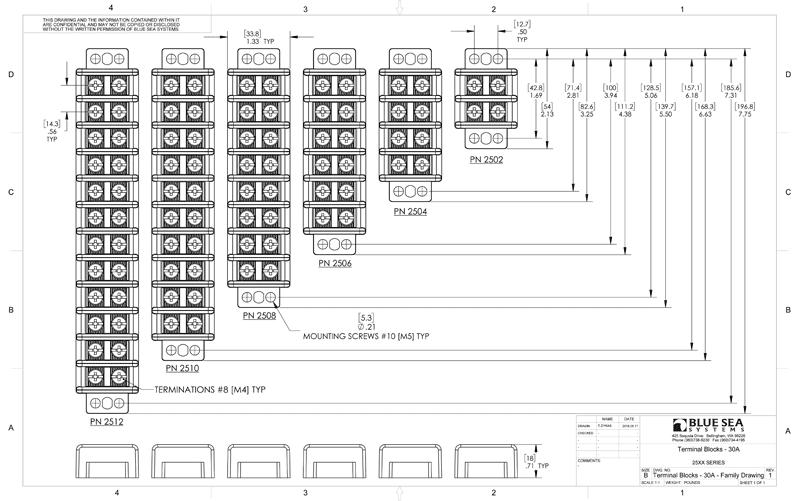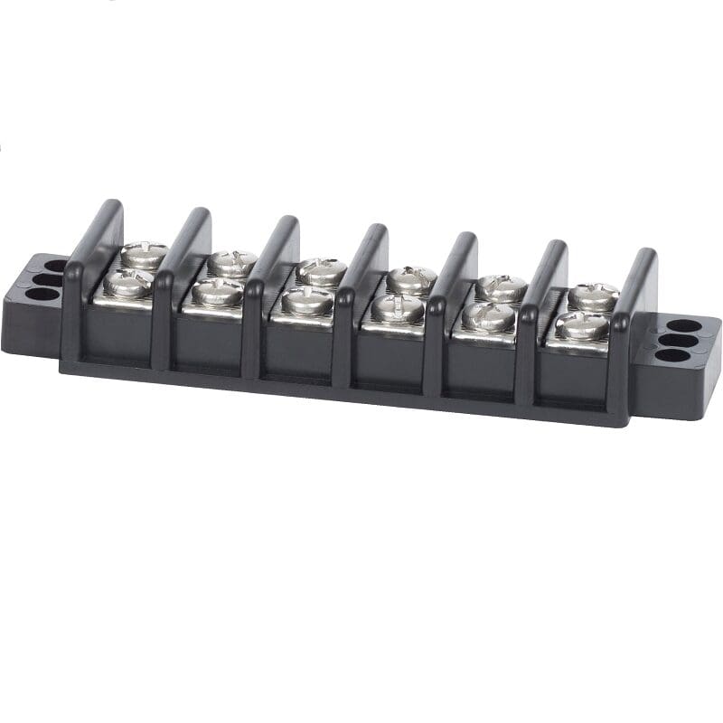 Blue Sea Terminal blok 30A met 6 circuits. Ontwerp met gesloten achterkant isoleert de stroom volledig van het montageoppervlak. Elk schroevenpaar is één geïsoleerd circuit.
