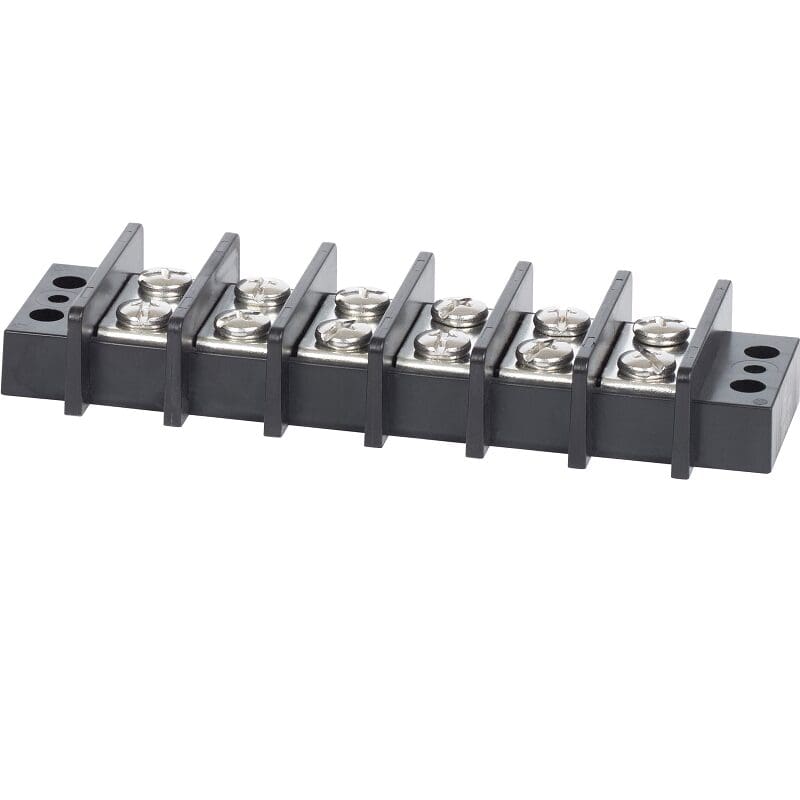 Blue Sea Terminal blok 65A met 6 circuits. Ontwerp met gesloten achterkant isoleert de stroom volledig van het montageoppervlak. Elk schroevenpaar is één geïsoleerd circuit.