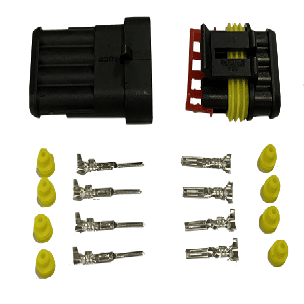 Een complete Superseal connector 4 polige set voor het waterdicht (IP67) maken van een elektrische draad. Eveneens bestand tegen Ozon, benzine, diesel, remvloeistof en motorolie. Zo is het mogelijk een waterdichte verbinding te creëren in diverse toepassingsgebieden.