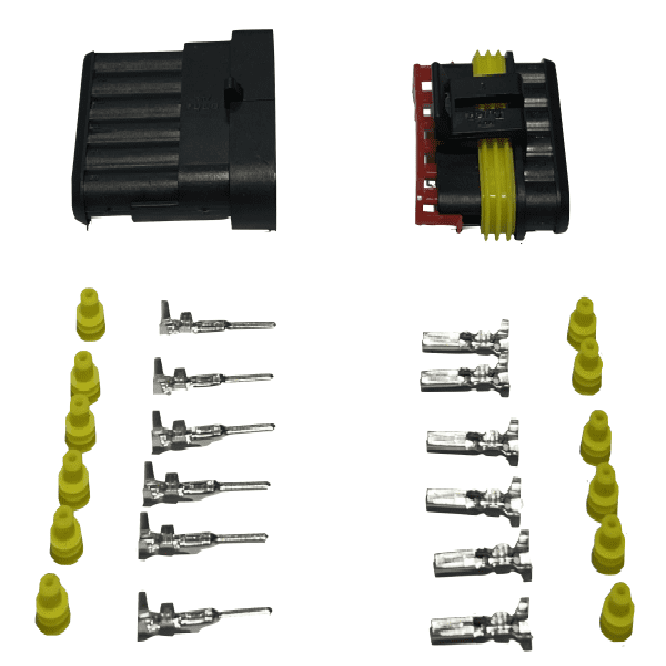 Een complete Superseal connector 6 polige set voor het waterdicht (IP67) maken van een elektrische draad. Eveneens bestand tegen Ozon, benzine, diesel, remvloeistof en motorolie. Zo is het mogelijk een waterdichte verbinding te creëren in diverse toepassingsgebieden.