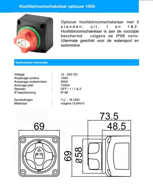 Batterijkeuzeschakelaar 100A IP68 12-50Vdc