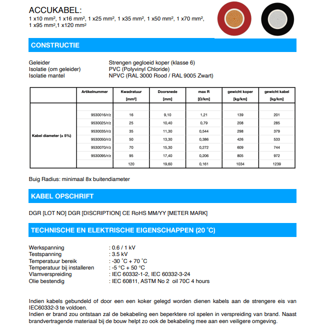 Accukabel 95mm² Dubbel Geïsoleerd IEC 60332-3 verkrijgbaar in de kleuren rood en zwart. Te bestellen per meter of per volle rol van 50 meter. Flexibel, Dubbel Geïsoleerd en Oliebestendig. Wanneer u 3 meter bestelt krijgt u uiteraard een accukabel met een vaste lengte van 3 meter. Vaste lengtes kunnen niet langer zijn dan 50 meter!