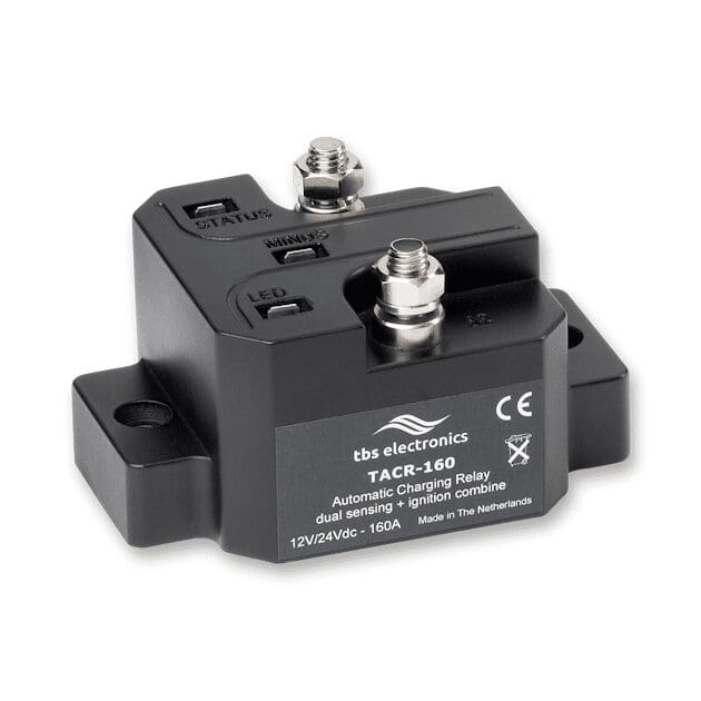 In een boot of voertuig met twee accubanken, is het handig om beide banken onderweg op te laden. Met de TACR-160 kunnen twee accubanken worden opgeladen via één bron, zoals een dynamo, maar houdt de accu’s geïsoleerd van elkaar wanneer ze niet worden opgeladen. Dit om te voorkomen dat de ene accubank de andere ontlaadt. Als één accubank toch leeg raakt, is er altijd een geladen accubank beschikbaar voor een eventuele noodstart.