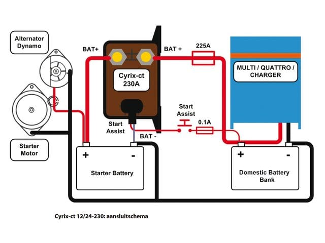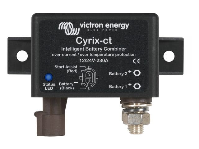 De Cyrix Victron 230A doet alles wat de 120A ook kan en meer. Dit scheidingsrelais kan een maximale laadspanning aan van 230A en is tevens voorzien van een ledindicatie. Onderstaand vindt u de aanduidingen van deze ledindicaties. De Cyrix is vrij eenvoudig te installeren. Deze dient na de startaccu in het circuit gelust te worden. De Cyrix detecteerd zelf welke boordspanning u gebruikt. Let wel op, enkel voor 12 en 24V toepasbaar.