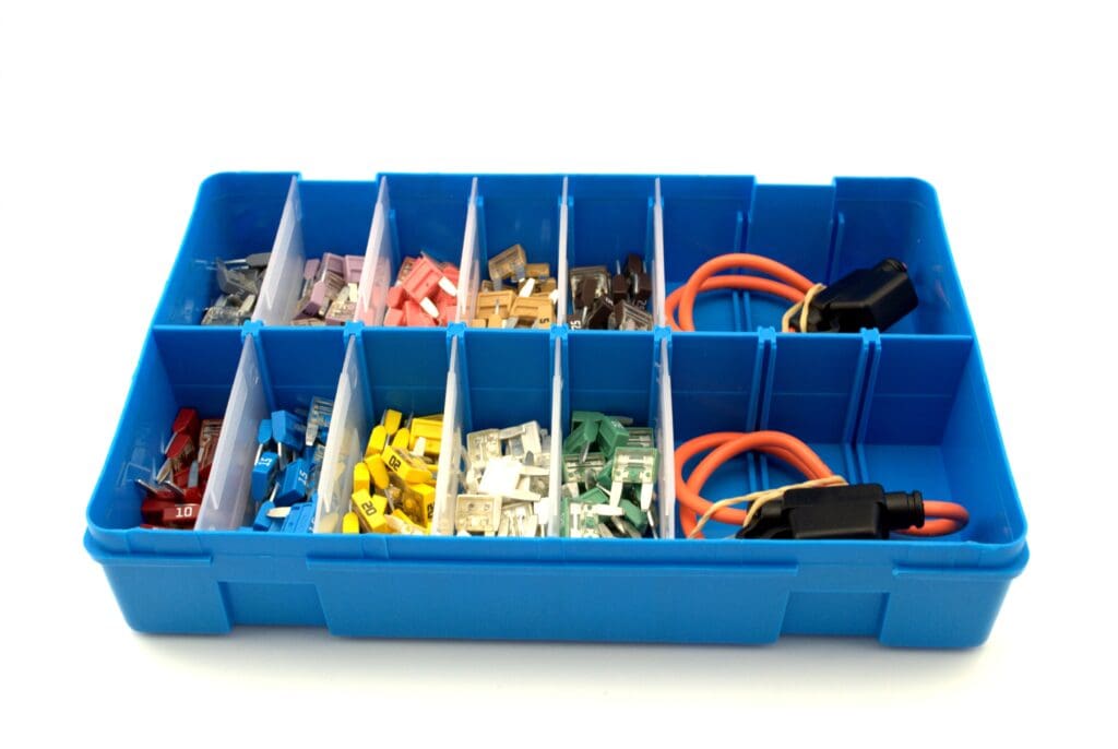 Voordeel Assortiment Mini Steekzekeringen 2-30Ah in een afsluitbare kunststof box gevuld met 250 zekeringen en twee zekeringhouders.