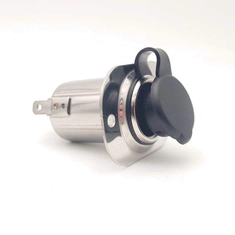 Sigarettenplug Contactdoos van Titan voor 12V toepassingen – gemaakt van gepolijst RVS. Wordt geleverd met 2 aansluitkabels van circa 28 centimeter. 1 voor de vlakstekker aansluiting, 1 voor een rondstekker aansluiting. Andere uiteinde van de kabels zijn voorzien van een M5 ringkabelschoen.