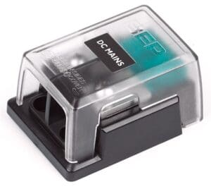 Maxi Zekeringhouder Schroef, Inclusief Afdekkap. Via het schroefgat op de kop van de zekeringhouder is deze ergens op te monteren, en vervolgens na installatie netjes de afdekkap erop te zetten.
