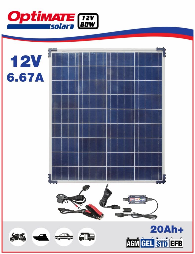 Zonnepaneel Pakket OptiMate Solar 80W 12V. De OptiMate Solar 80W 12V is de grootste variant van OptiMate Solar. Met een laadstroom van 6,67 per uur is dit paneel geschikt voor middelgrote huishoud accu’s. Onderstaand de eigenschappen van dit OptiMate Solar 80W 12V Zonnepaneel Pakket.