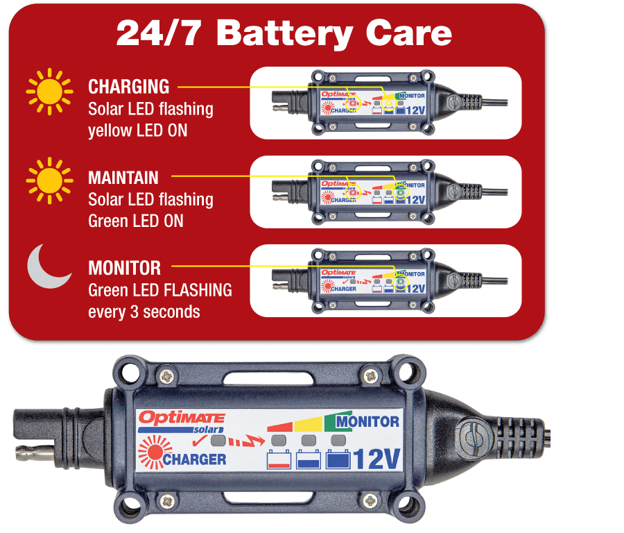 Snelste manier van laden – dankzij de ‘slim laden’-regeling die naargelang de sterkte van het zonlicht voor pulslading of continue lading kiest. lntelligent onderhoud – gaat de volgende dag verder als de accu de lading ’s nachts vasthield; zo niet gaat het programma over op de stap OPTIMALISEREN.